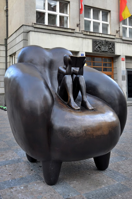 ... a pokračujeme kolem Stavovského divadla na Staroměstské náměstí. Na sousedním náměstí Franze Kafky je instalována socha Čtenář v křesle od Jaroslava Róny. O vzniku svého díla řekl (Reflex 44/2020): „Je dozvukem objednávky, kterou si u mně, vášnivého čtenáře, zadal David Vávra. Socha původně vznikala na místo před budovou knihovny v Hradci Králové, vytbvořené přestavbou bývalé továrny Vertex pod Davidovým vedením. I když už tenkrát jsem tušil, že tam asi stát nebude stejně jako Davidova instalace – měl jsem pocit, že ředitelce nějak nesedíme. Přestavba se nakonec povedla, jen naše sochy tam nejsou.“