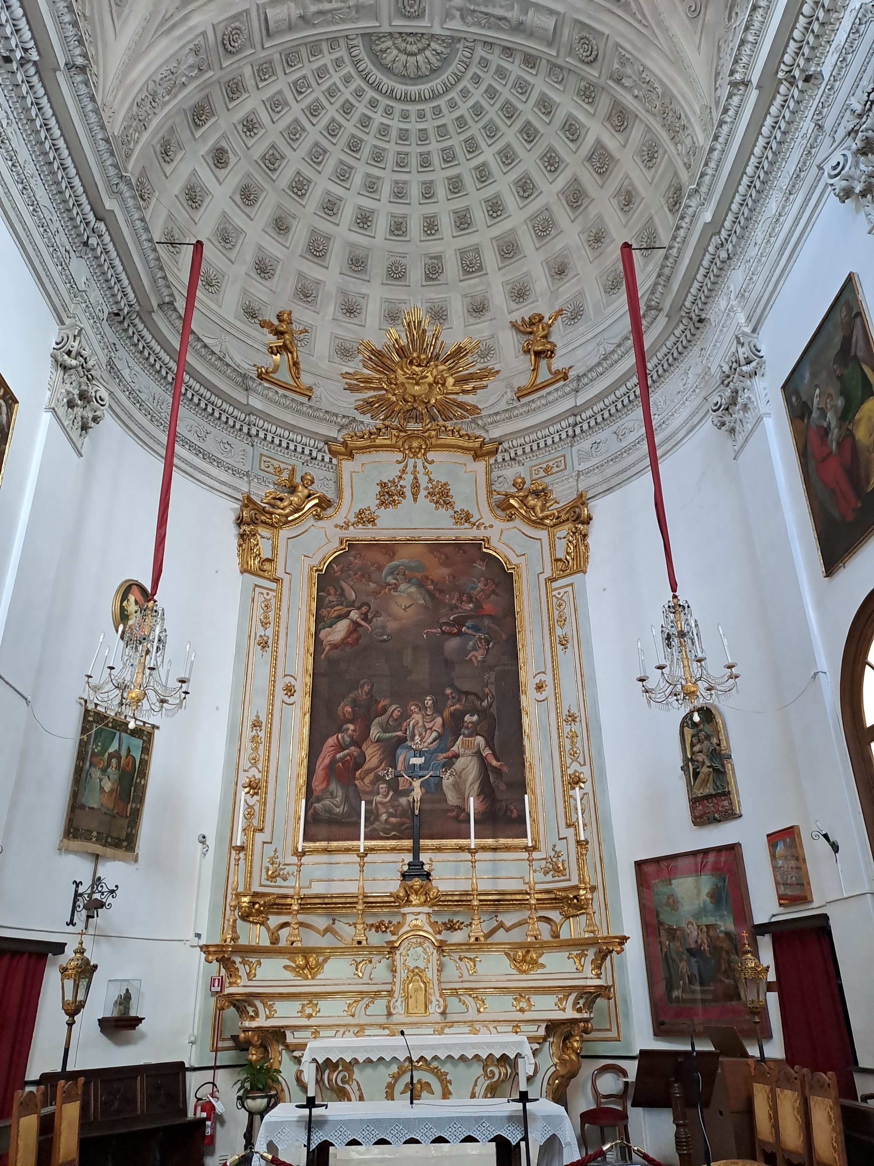 Interiér je bez fresek zdobený štuky a na bočních stěnách má na každé straně tři velká plátna z 18. století. Na zadní stěně nad hlavním oltářem stojí plátno Svaté rodiny se světci Joachimem a Annou, dílo Španěla Vincenza Suareze z května 1788: